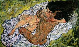 Casi sin darnos cuenta, sus casas superpuestas dejan paso a su retratos y autorretratos, en una sucesión de instantáneas que nos muestran bien a las claras las dotes de gran dibujante de este pintor austriaco, que consigue con apenas unos trazos, proporcionar de una singular vida a sus personajes, a los que por no faltarles, no les hace falta casi ni colorearles la piel, pues en sí misma se ensalza de una forma independiente de todo aquello que no sea el trazo que la define. Pero no todo es simplicidad en las formas de sus retratos, pues esa expresividad que tanto marca su obra, se desplaza tanto en las posturas y en los gestos que contienen sus formas humanas, que en ocasiones llegan al éxtasis del amor, con por ejemplo sucede en el cuadro “el abrazo”, donde unas figuras humanas entrelazadas en una superficie que a modo de alfombra mágica los traslada por un espacio sin límites ni roces, nos hace sentirnos por fin libres de toda atadura, y nos concede esa extraña capacidad del deseo sin límites.