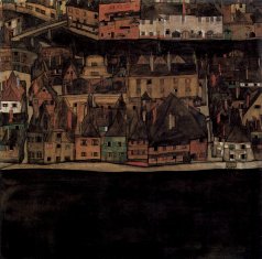 Una gran fotografía de cuerpo entero del artista delante de un espejo al inicio de la exposición, es la primera pista acerca de cuál es la esencia de lo que luego vamos a ver, que no es otra, que esa particular y atormentada mirada con la que Schiele observa el mundo. Ese universo convulso que recorre los días de su existencia, se inician en el Leopold Museum con su superpuesta capacidad para dotar a las casas de una vida que al natural no tienen, transformando su linealidad en una superposición de objetos que reclaman nuestra atención no sólo por la fuerza que desprenden los colores con los que los ha pintado, sino también, por esa ausencia de perspectiva, dejándonos indefensos ante esa única y nueva imagen tan distinta a la real, que en este caso, juega a enseñarnos la realidad desde un punto de vista que no conocíamos. Sus construcciones, por tanto, se desenvuelven como formas superpuestas que intentan transmitirnos esa capacidad de fuerza y tenebrismo que también conjuga Schiele en sus paisajes arquitectónicos.