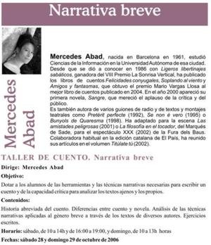 Mercedes Abad impartirá un taller de narrativa breve en la escuela de escritores Alonso Quijano el fin de semana del 28 y 29 de octubre de 2006