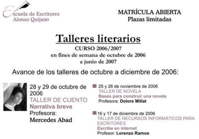 LA ESCUELA DE ESCRITORES «ALONSO QUIJANO» ofrece hasta diciembre una serie de talleres literarios muy interesantes, realizados en fin de semana, (cuento,novela y recursos informáticos para escritores). Con alojamiento en el Hotel Convento de Santa clara, un refugio de antaño con