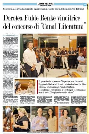 LA VOCE DELL’ISOLA, un periódico de Catania (Sicilia), publica una referencia completa a la entrega de premios 2008 con referencia a todos los ganadores y finalistas, jurados y premios. Maria Luisa Núñez,Presidenta de la Asociación Canal Literatura y directora de esta web y Domecico Coco colaboran ya desde hace varios meses estableciendo un contacto permanente entre ambos medios de comunicación.