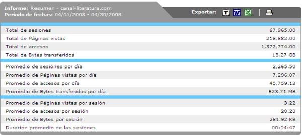 Un total de 1.372.774 visitas sólo en el mes de abril del 2008,con un promedio de 7.296 páginas vistas al día.