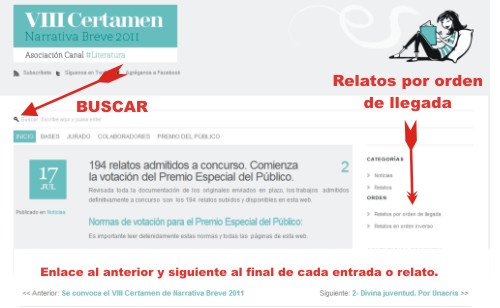 1– En el menú de la derecha, hay un enlace que pone “Relatos por orden de llegada”. Pinchando en él obtendrá los relatos empezando por el nº 1.