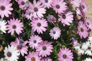 Una tumba sembrada con bellas dalias lilas y blancas